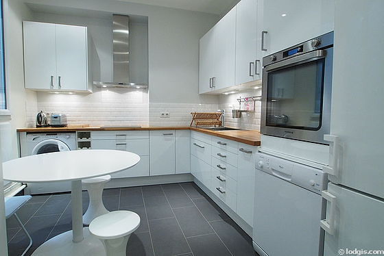 Questo appartamento dispone di una bella cucina e tutto l'equipaggiamento necessario per la vita quotidiana : piani di cottura, frigorifero, congelatore, forno, cappa di aspirazione, tostapane, bollitore elettrico, tavola da pranzo, scaffale, stoviglie.