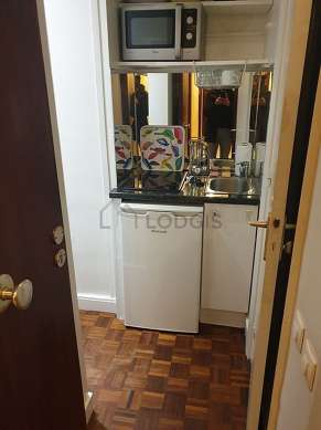 Questo appartamento dispone di una bella cucina con del parquet al suolo e tutto l'equipaggiamento necessario per la vita quotidiana : piani di cottura, frigorifero, forno microonde, congelatore, bollitore elettrico, armadio, stoviglie.
