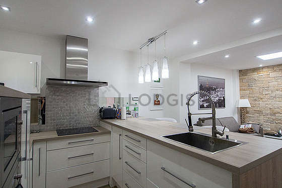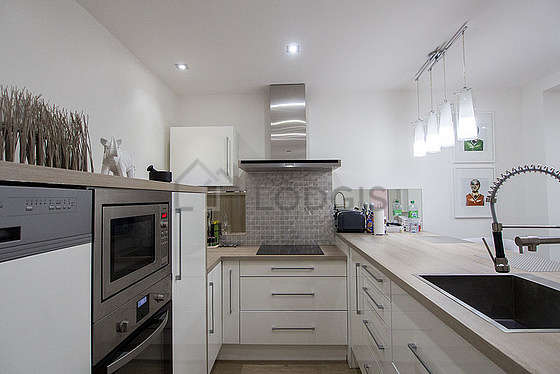 Questo appartamento dispone di una bella cucina con del piastrelle al suolo e tutto l'equipaggiamento necessario per la vita quotidiana : piani di cottura, frigorifero, congelatore, forno, forno microonde, cappa di aspirazione, tostapane, bollitore elettrico, caffettiera, scaffale, armadio, stoviglie, sgabello, bar.
