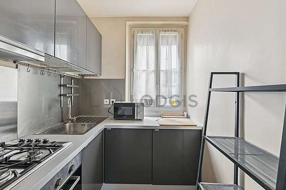 Questo appartamento dispone di una bella cucina con del piastrelle al suolo e tutto l'equipaggiamento necessario per la vita quotidiana : piani di cottura, frigorifero, congelatore, forno, forno microonde, cappa di aspirazione, tostapane, bollitore elettrico, caffettiera, scaffale, armadio, stoviglie.