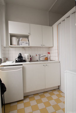 Questo appartamento dispone di una cucina con del piastrelle al suolo e tutto l'equipaggiamento essenziale per la vita quotidiana : piani di cottura, frigorifero, forno microonde, congelatore, tostapane, bollitore elettrico, caffettiera, armadio, stoviglie.