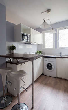 Questo appartamento dispone di una bella cucina con del parquet al suolo e tutto l'equipaggiamento essenziale per la vita quotidiana : piani di cottura, frigorifero, forno microonde, cappa di aspirazione, tostapane, armadio, stoviglie, sgabello, bar.