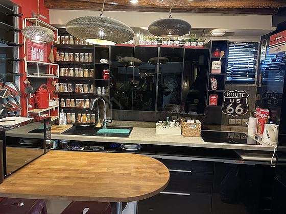 Questo appartamento dispone di una magnifica cucina con del piastrelle al suolo e tutto l'equipaggiamento necessario per la vita quotidiana : piani di cottura, frigorifero, congelatore, forno, forno microonde, tostapane, bollitore elettrico, caffettiera, armadio, stoviglie.