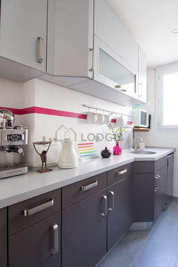 Questo appartamento dispone di una magnifica cucina con del piastrelle al suolo e tutto l'equipaggiamento essenziale per la vita quotidiana : piani di cottura, frigorifero, congelatore, forno, cappa di aspirazione, bollitore elettrico, caffettiera, armadio, stoviglie.