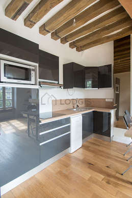 Questo appartamento dispone di una magnifica cucina con del parquet al suolo e tutto l'equipaggiamento essenziale per la vita quotidiana : piani di cottura, frigorifero, congelatore, microonde multifunzione, cappa di aspirazione, bollitore elettrico, caffettiera, scaffale, armadio, stoviglie.