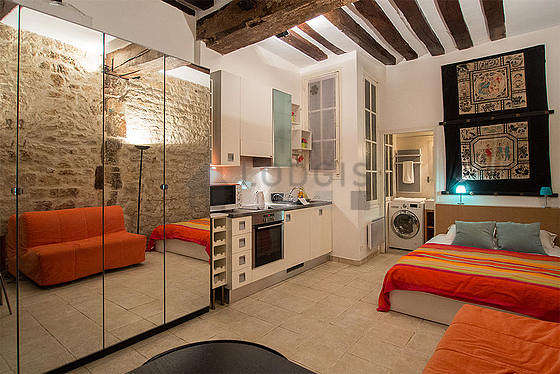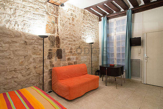 Questo appartamento é composto di un attraente salone con del piastrelle al suolo e delle finestras e vista su cortile. Questo salone molto calmo é ammobiliato e equipaggiato per rendere il tuo soggiorno piacevole : televisione, lenzuola, coperte, tavola da pranzo, guardaroba, scaffale, armadio, pietre visibili, trave, 4 sedia (e)1 divano letto, 1 letto.