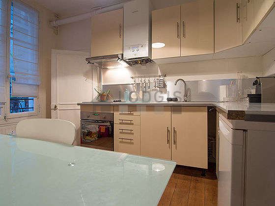 Questo appartamento dispone di una bella cucina con del parquet al suolo e tutto l'equipaggiamento essenziale per la vita quotidiana : piani di cottura, frigorifero, congelatore, forno, cappa di aspirazione, tostapane, caffettiera, tavola da pranzo, scaffale, armadio, stoviglie, 1 sedia (e).