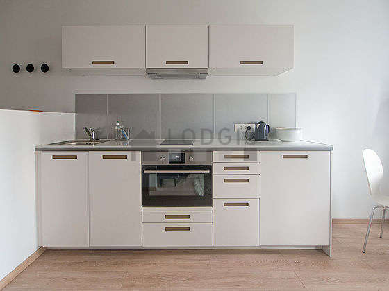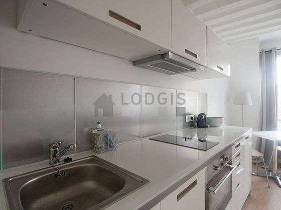 Questo appartamento dispone di una magnifica cucina con del parquet al suolo e tutto l'equipaggiamento essenziale per la vita quotidiana : piani di cottura, congelatore, microonde multifunzione, congelatore, cappa di aspirazione, bollitore elettrico, armadio, stoviglie, trave.