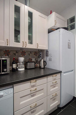 Questo appartamento dispone di una bella cucina con del piastrelle al suolo e tutto l'equipaggiamento necessario per la vita quotidiana : piani di cottura, frigorifero, congelatore, forno, forno microonde, cappa di aspirazione, tostapane, bollitore elettrico, caffettiera, scaffale, stoviglie.