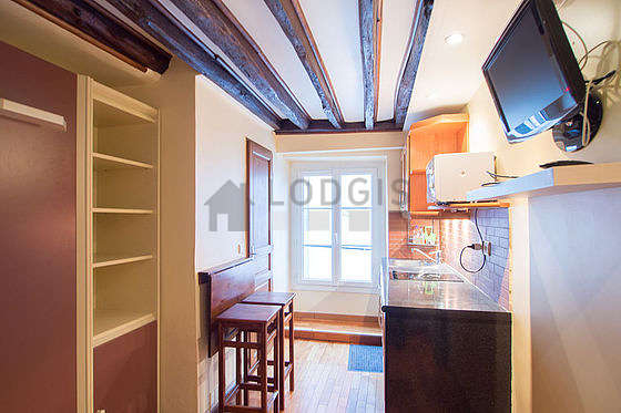 Questo appartamento dispone di una bella cucina con del parquet al suolo e tutto l'equipaggiamento indispensabile per la vita quotidiana : piani di cottura, frigorifero, forno microonde, congelatore, bollitore elettrico, caffettiera, scaffale, armadio, stoviglie.