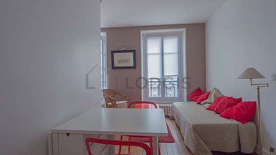 Questo appartamento é composto di un piacevole salone con del parquet al suolo e delle finestras anti-rumore e vista su strada. Questo salone calmo é ammobiliato e equipaggiato per rendere il tuo soggiorno piacevole : televisione, lenzuola, coperte, 1 poltrona (e), tavola da pranzo, scrivania, scaffale, 1 sedia (e)1 letto, 1 letto.