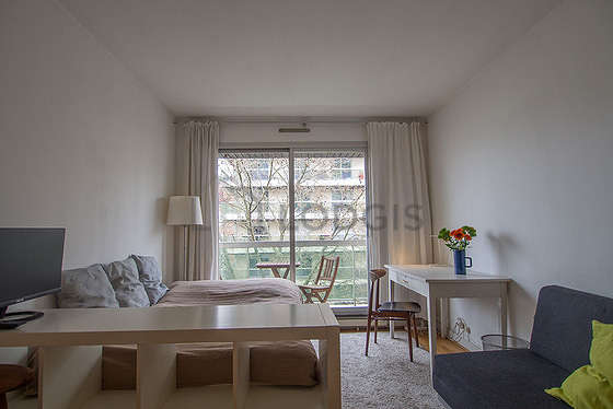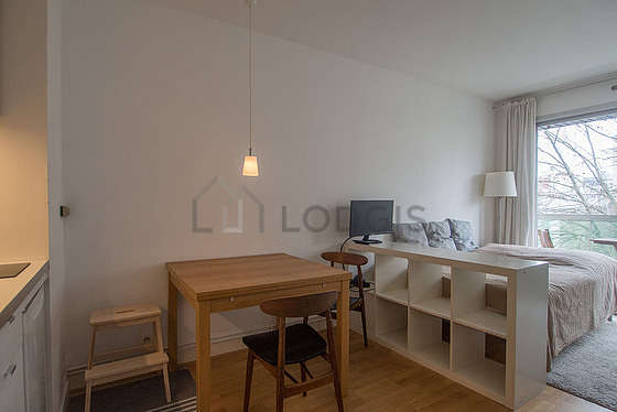 Questo appartamento é composto di un piacevole salone con del parquet al suolo e delle finestras con balcon e vista su giardino. Questo salone calmo é ammobiliato e equipaggiato per rendere il tuo soggiorno piacevole : televisione, lenzuola, coperte, divano, scrivania, guardaroba, scaffale, armadio, 1 sedia (e)1 letto.
