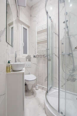 Questo appartamento é equipaggiato di un bagno piacevole e chiaro with finestras. Questo bagno é dotato di tutto il necessario per il tuo benessere quotidiano : asciugamani da bagno, scaffale, armadio, doccia, asciugacapelli, sink, radiatore porta asciugamani. Il WC é integrato nel bagno