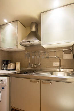 Questo appartamento dispone di una bella cucina con del parquet al suolo e tutto l'equipaggiamento necessario per la vita quotidiana : piani di cottura, forno, congelatore, cappa di aspirazione, tostapane, bollitore elettrico, caffettiera, armadio, stoviglie, trave.