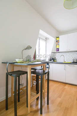 Questo appartamento dispone di una bella cucina con del parquet al suolo e tutto l'equipaggiamento essenziale per la vita quotidiana : piani di cottura, frigorifero, congelatore, forno, tostapane, bollitore elettrico, caffettiera, tavola da pranzo, armadio, stoviglie, 4 sedia (e), sgabello.