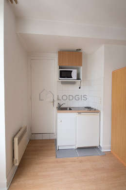 Questo appartamento dispone di una bella cucina con del parquet al suolo e tutto l'equipaggiamento indispensabile per la vita quotidiana : piani di cottura, frigorifero, forno microonde, congelatore, scaffale, armadio, stoviglie.