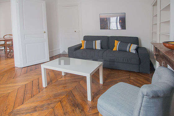 SoggiornoQuesto appartamento é composto di un attraente salone con del parquet al suolo vista su cortile. Questo salone calmo é ammobiliato e equipaggiato per rendere il tuo soggiorno piacevole : televisione, divano, 1 poltrona (e), tavolino, biblioteca, entry way table, tv stand, curtains, painting.