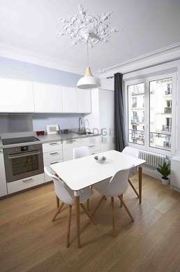 Questo appartamento dispone di una bella cucina adiacent al soggiorno con del parquet al suolo e tutto l'equipaggiamento indispensabile per la vita quotidiana : piani di cottura, frigorifero, congelatore, forno, forno microonde, cappa di aspirazione, tostapane, bollitore elettrico, caffettiera, tavola da pranzo, armadio, stoviglie, 4 sedia (e).