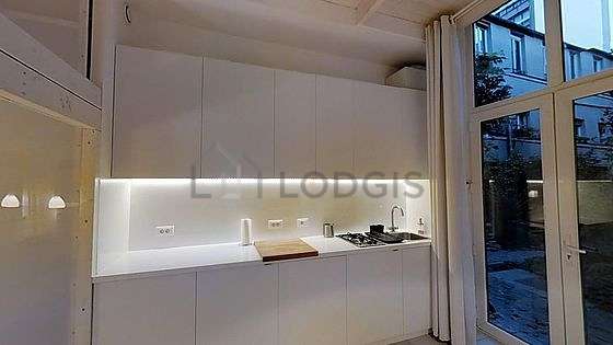 Questo appartamento dispone di una cucina adiacent al soggiorno con del piastrelle al suolo e tutto l'equipaggiamento necessario per la vita quotidiana : piani di cottura, frigorifero, forno microonde, congelatore, tostapane, bollitore elettrico, caffettiera, stoviglie, bar.