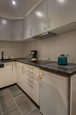 Questo appartamento dispone di una bella cucina adiacent al soggiorno con del piastrelle al suolo e tutto l'equipaggiamento indispensabile per la vita quotidiana : piani di cottura, frigorifero, forno microonde, congelatore, cappa di aspirazione, tostapane, caffettiera, scaffale, armadio, stoviglie, bar.