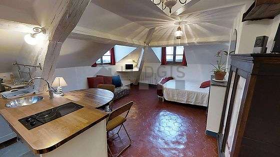 Questo appartamento é composto di un attraente salone con della coccio al suolo vista su strada. Questo salone calmo é ammobiliato e equipaggiato per rendere il tuo soggiorno piacevole : lenzuola, coperte, tavola da pranzo, guardaroba, scaffale, armadio, trave, camino, 2 sedia (e)1 letto.