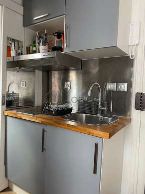 Questo appartamento dispone di una bella cucina adiacent al soggiorno con del parquet al suolo e tutto l'equipaggiamento necessario per la vita quotidiana : piani di cottura, frigorifero, microonde multifunzione, congelatore, caffettiera, scaffale, armadio, armadio, stoviglie, 1 sedia (e), bin.