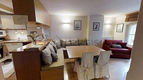 Questo appartamento é composto di un attraente salone con del parquet al suolo vista su strada. Questo salone calmo é ammobiliato e equipaggiato per rendere il tuo soggiorno piacevole : televisione, 1 poltrona (e), tavola da pranzo, scaffale, armadio, como', 2 sedia (e)1 divano letto.