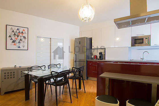 Questo appartamento dispone di una magnifica cucina con del parquet al suolo e tutto l'equipaggiamento essenziale per la vita quotidiana : piani di cottura, frigorifero, congelatore, forno, forno microonde, cappa di aspirazione, tostapane, bollitore elettrico, caffettiera, tavola da pranzo, armadio, stoviglie, 4 sedia (e), sgabello, bar.