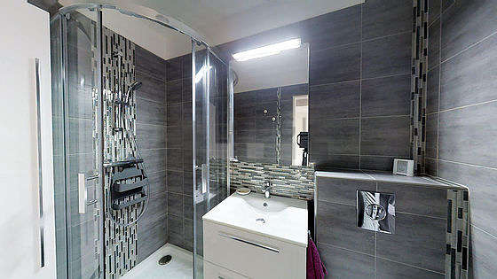Questo appartamento é equipaggiato di un bagno magnifica. Questo bagno é dotato di tutto il necessario per il tuo benessere quotidiano : asciugamani da bagno, scaffale, armadio, doccia, asciugacapelli, sink, radiatore porta asciugamani. Il WC é integrato nel bagno