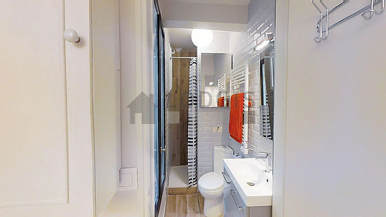 Questo appartamento é equipaggiato di un bagno piacevole e chiaro with finestras anti-rumore. Questo bagno é dotato di tutto il necessario per il tuo benessere quotidiano : asciugamani da bagno, scaffale, armadio, doccia, asciugacapelli, sink, radiatore porta asciugamani. Il WC é integrato nel bagno
