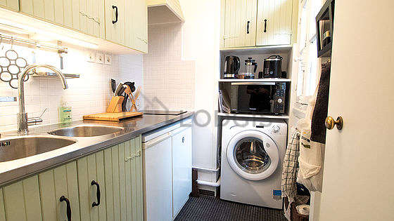 Questo appartamento dispone di una magnifica cucina con del piastrelle al suolo e tutto l'equipaggiamento necessario per la vita quotidiana : piani di cottura, frigorifero, microonde multifunzione, congelatore, cappa di aspirazione, tostapane, bollitore elettrico, caffettiera, scaffale, armadio, stoviglie.