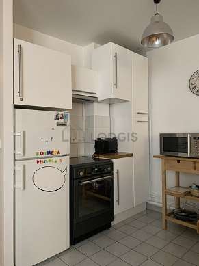 Questo appartamento dispone di una bella cucina con del piastrelle al suolo e tutto l'equipaggiamento necessario per la vita quotidiana : piani di cottura, frigorifero, congelatore, forno, forno microonde, cappa di aspirazione, tostapane, bollitore elettrico, caffettiera, tavola da pranzo, scaffale, armadio, stoviglie, 2 sedia (e).