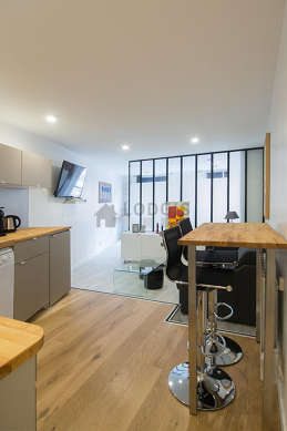 Questo appartamento dispone di una magnifica cucina con del parquet al suolo e tutto l'equipaggiamento necessario per la vita quotidiana : piani di cottura, frigorifero, forno, congelatore, bollitore elettrico, caffettiera, tavola da pranzo, armadio, stoviglie, sgabello.