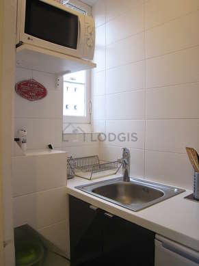 Questo appartamento dispone di una cucina con del piastrelle al suolo e tutto l'equipaggiamento essenziale per la vita quotidiana : piani di cottura, frigorifero, forno microonde, stoviglie, robot da cucina.