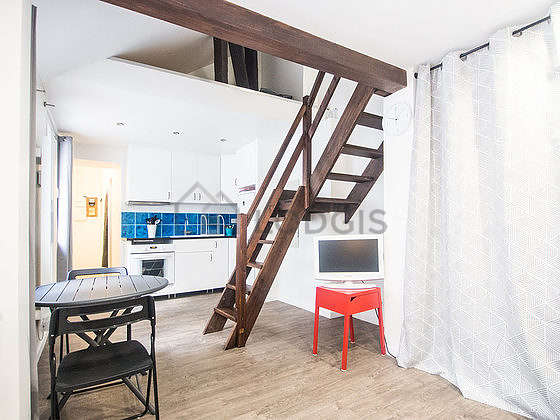 Grazie a una bella altezza del soffitto, si é potuto montare un soppalco in questo appartamento , offrendoti cosi un locale in più dotata de lenzuola, coperte.