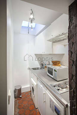 Questo appartamento dispone di una cucina con della coccio al suolo e tutto l'equipaggiamento essenziale per la vita quotidiana : frigorifero, forno microonde, congelatore, tostapane, como'.