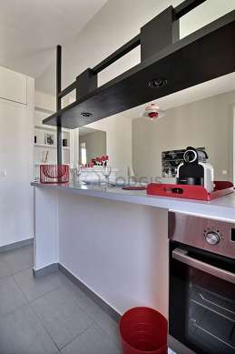 Questo appartamento dispone di una magnifica cucina con del piastrelle al suolo e tutto l'equipaggiamento necessario per la vita quotidiana : piani di cottura, frigorifero, congelatore, forno, forno microonde, cappa di aspirazione, tostapane, caffettiera, scaffale, armadio, stoviglie, sgabello, bar, bin.