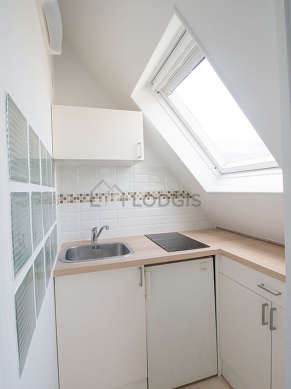 Questo appartamento dispone di una bella cucina con del piastrelle al suolo e tutto l'equipaggiamento essenziale per la vita quotidiana : piani di cottura, frigorifero, armadio, stoviglie.