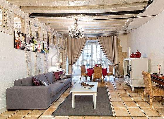Questo appartamento é composto di un superbo salone con del piastrelle al suolo e delle finestras. Questo salone calmo é ammobiliato e equipaggiato per rendere il tuo soggiorno piacevole : televisione, 1 poltrona (e), tavola da pranzo, tavolino, scrivania, biblioteca, pietre visibili, trave, 5 sedia (e), floor lamp, lamp, chandelier, tv stand, painting, carpet.