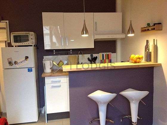 Questo appartamento dispone di una bella cucina con del piastrelle al suolo e tutto l'equipaggiamento essenziale per la vita quotidiana : frigorifero, forno, cappa di aspirazione, scaffale, armadio, sgabello, bar, lamp.