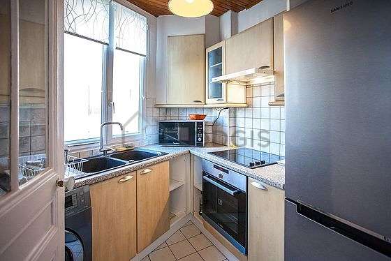 Questo appartamento dispone di una cucina con del piastrelle al suolo e tutto l'equipaggiamento indispensabile per la vita quotidiana : piani di cottura, frigorifero, congelatore, forno, forno microonde, tostapane, armadio, stoviglie.