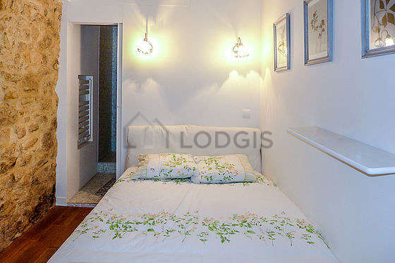 Con del parquet al suolo e delle finestras questa camera attraente offre l'equipaggiamento necessario per riposarti durante il tuo soggiorno : lenzuola, coperte, armadio, pietre visibili, trave1 letto.