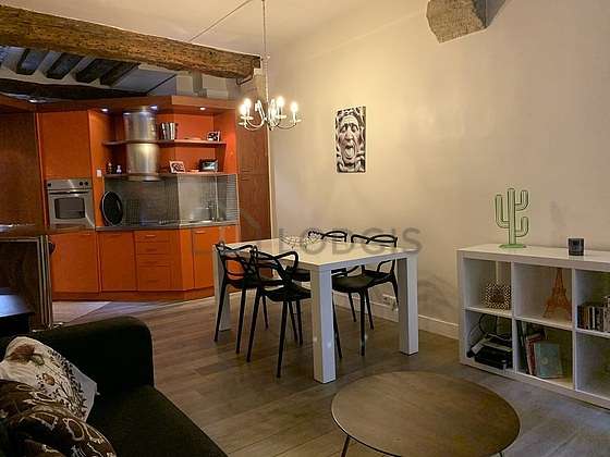 Questo appartamento dispone di una magnifica cucina con del parquet al suolo e tutto l'equipaggiamento indispensabile per la vita quotidiana : piani di cottura, frigorifero, forno, forno microonde, congelatore, cappa di aspirazione, armadio, stoviglie, sgabello, bar.