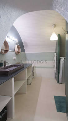 Questo appartamento dispone di una magnifica cucina con del piastrelle al suolo e tutto l'equipaggiamento necessario per la vita quotidiana : piani di cottura, frigorifero, congelatore, forno, forno microonde, cappa di aspirazione, armadio, stoviglie, pietre visibili, trave.