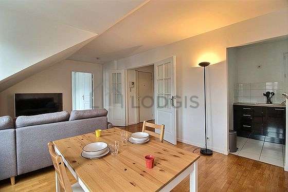 SoggiornoQuesto appartamento é composto di un magnifico salone con del parquet al suolo e delle finestras. Questo salone molto calmo é ammobiliato e equipaggiato per rendere il tuo soggiorno piacevole : televisione, divano, tavola da pranzo, tavolino, guardaroba, armadio, 1 sedia (e).