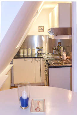 Questo appartamento dispone di una cucina con del parquet al suolo e tutto l'equipaggiamento essenziale per la vita quotidiana : frigorifero, forno, cappa di aspirazione, tostapane, armadio, stoviglie.