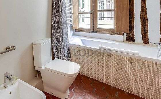 Questo appartamento é equipaggiato di un bagno piacevole e chiaro with finestras. Questo bagno é dotato di tutto il necessario per il tuo benessere quotidiano : vasca da bagno, asciugacapelli, pompa d'evacuazione, sink, radiatore porta asciugamani. Il WC é integrato nel bagno