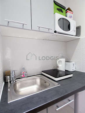 Questo appartamento dispone di una magnifica cucina con del piastrelle al suolo e tutto l'equipaggiamento indispensabile per la vita quotidiana : piani di cottura, frigorifero, forno microonde, tostapane, caffettiera, scaffale, armadio.