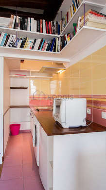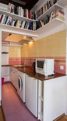 Questo appartamento dispone di una bella cucina con del piastrelle al suolo e tutto l'equipaggiamento necessario per la vita quotidiana : piani di cottura, frigorifero, forno microonde, congelatore, cappa di aspirazione, bollitore elettrico, caffettiera, scaffale, armadio, stoviglie.