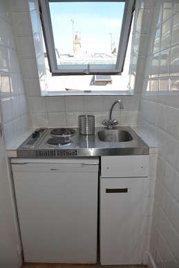 Questo appartamento dispone di una bella cucina con del parquet al suolo e tutto l'equipaggiamento indispensabile per la vita quotidiana : piani di cottura, frigorifero, forno microonde, congelatore, tostapane, scaffale, armadio, stoviglie.